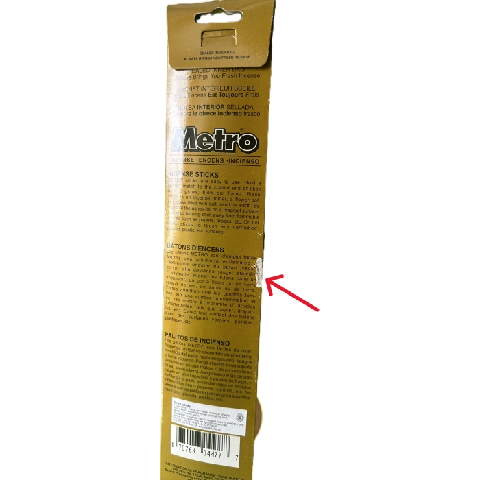 Upozornění: Udržujte bezpečnou vzdálenost od hořící tyčinky. Používejte vonné tyčinky ve větraném prostoru. Uchovávejte mimo dosah dětí. Ujistěte se, že popel dopadá na nehořlavý povrch.