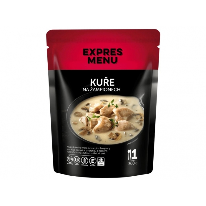 Složení: kuřecí stehenní maso (33 %), drůbeží vývar (voda, drůbeží maso a kosti), žampiony (6 %), smetana, řepkový olej, rýžová mouka, kukuřičná mouka, cibule, máslo, sůl kamenná, kmín.