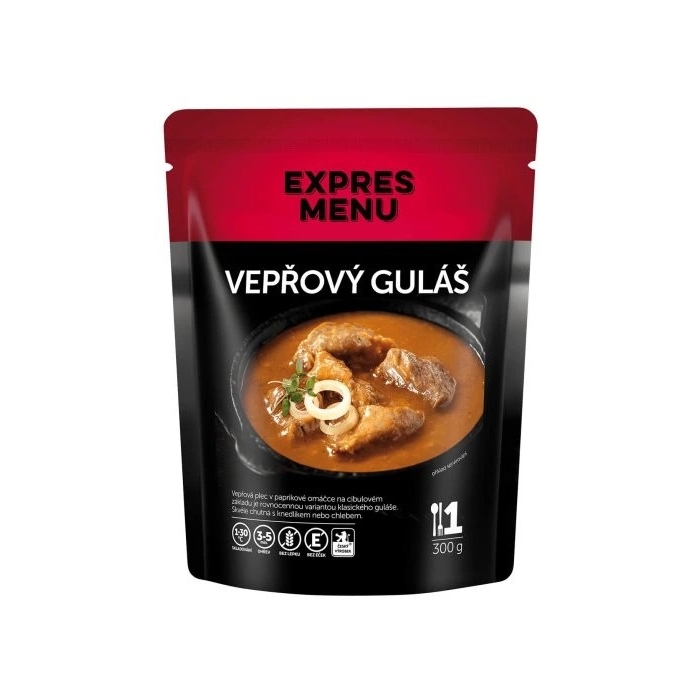 Vepřová plec (33 %), hovězí vývar (voda, hovězí maso a kosti), cibule, rýžová mouka, kukuřičná mouka, řepkový olej, rajčatový protlak (voda, rajčatový protlak, sůl), paprika mletá, česnek, sůl kamenná, majoránka, kmín, pepř.