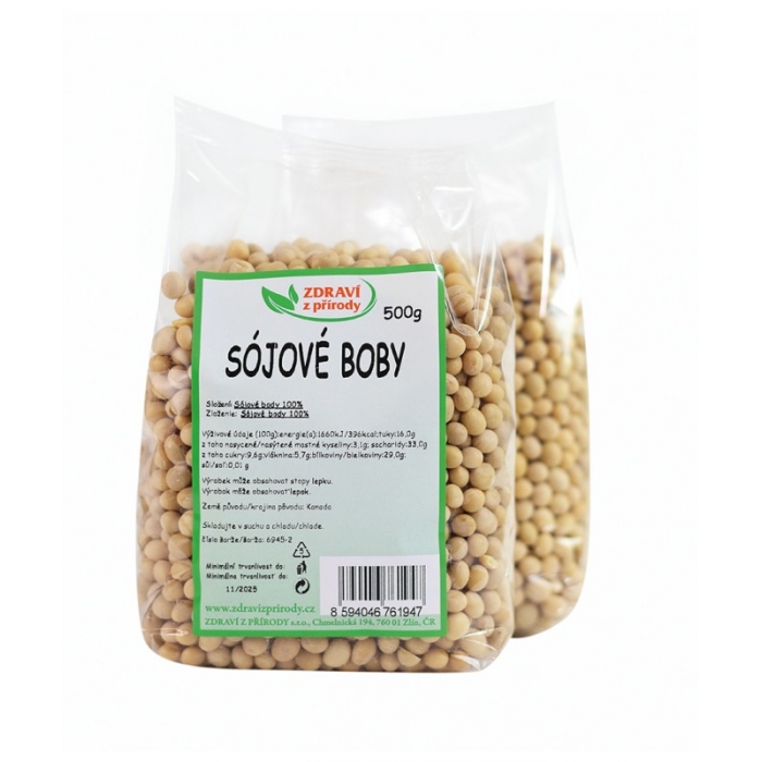 Návod k přípravě: Sójové boby se namáčí 8-12 hodin a poté se vaří 4 hodiny, z toho první hodinu na prudkém plameni. V tlakovém hrnci se uvaří za padesát minut. Kalorická hodnota/energie (na 100g): 1866 kJ/446 kcal. Bílkoviny: 36,5 g. Sacharidy: 30,2 g (z toho cukry 7,3 g) . Tuky: 19,9 g (z toho nasycené mastné kyseliny 2,9 g). Vláknina: 9,3. Popř. jiné (cholesterol, vitaminy apod.): Sodík 0,002 g Skladování: Skladujte při teplotě do 25°C a relativní vlhkosti vzduchu do 70 %.
