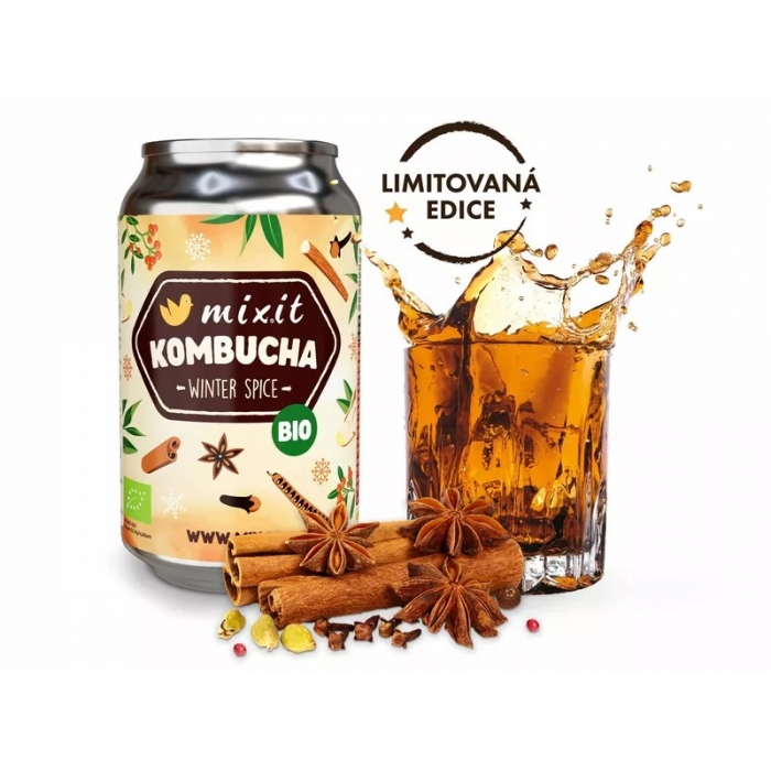 Posilněte svou imunitu s BIO Mixit kombuchou - Winter Spice. Tento prastarý fermentovaný nápoj, známý už od roku 200 před naším letopočtem, vzniká díky čajovým kulturám. Mixit BIO kombucha je obohacená o pořádnou porci voňavého zimního koření jako je skořice, zázvor, hřebíček nebo třeba černý pepř, přičemž veškeré koření pochází z kontrolovaného ekologického pěstování. Zdravý, šumivý nápoj s minimem kalorií. Nejlépe si ho vychutnáte vychlazený.
