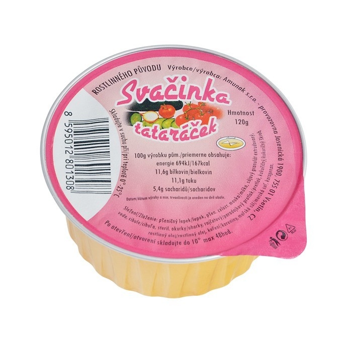 Luštěninová pomazánka balená v mističce s odtrhávacím víčkem. Tuto pomazánku není nutné uchovávat v chladu. Záruční doba 2 roky od data výroby je dosahována záhřevem na sterilační teplotu a následným šokovým chlazením.
