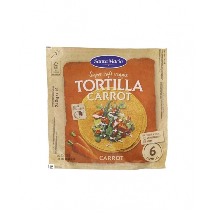 Pšeničná tortilla s obsahem 31% mrkve, bez konzervantů, vegan, výborný zdroj vlákniny. Tortilla je nadýchaná a jemná, lehce nasládlá díky mrkvi, s průměrem 20 cm.