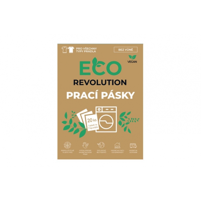 EcoRevolution prací pásky jsou skvěle koncentrovaný prací prostředek bez vody, který je zcela bez alergenů, parabenů a fosfátů. Balení pracích pásků Vám nejen ušetří spousty místa v koupelně, ale oproti klasickým pracím gelům či práškům jsou lehké, skladné a snadno si je přibalíte třeba na dovolenou nebo na výlet.