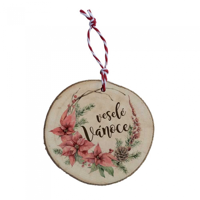 Ručně vyráběná dřevěná vánoční ozdoba s obrázkem – Veselé Vánoce