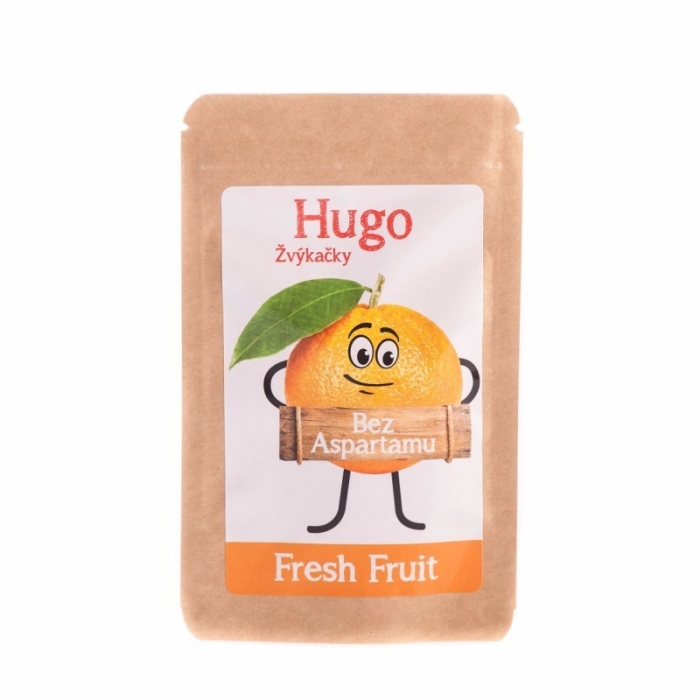 Hugo žvýkačky jsou výbornou alternativou běžných žvýkaček, jsou bez aspartamu, bez umělých sladidel, barviv a dalších chemických složek. Vyzkoušejte žvýkačky s přírodní pomerančovou příchutí! Jsou slazené pouze xylitolem, který se vyskytuje v kůře Břízy bělokoré nebo v ovoci. Žvýkačky mají skvělou chuť získanou přímo z přírodního aroma. Díky tomu, že v nich nejsou sladidla, mají o 40% méně kalorií a jsou vhodné i pro diabetiky.